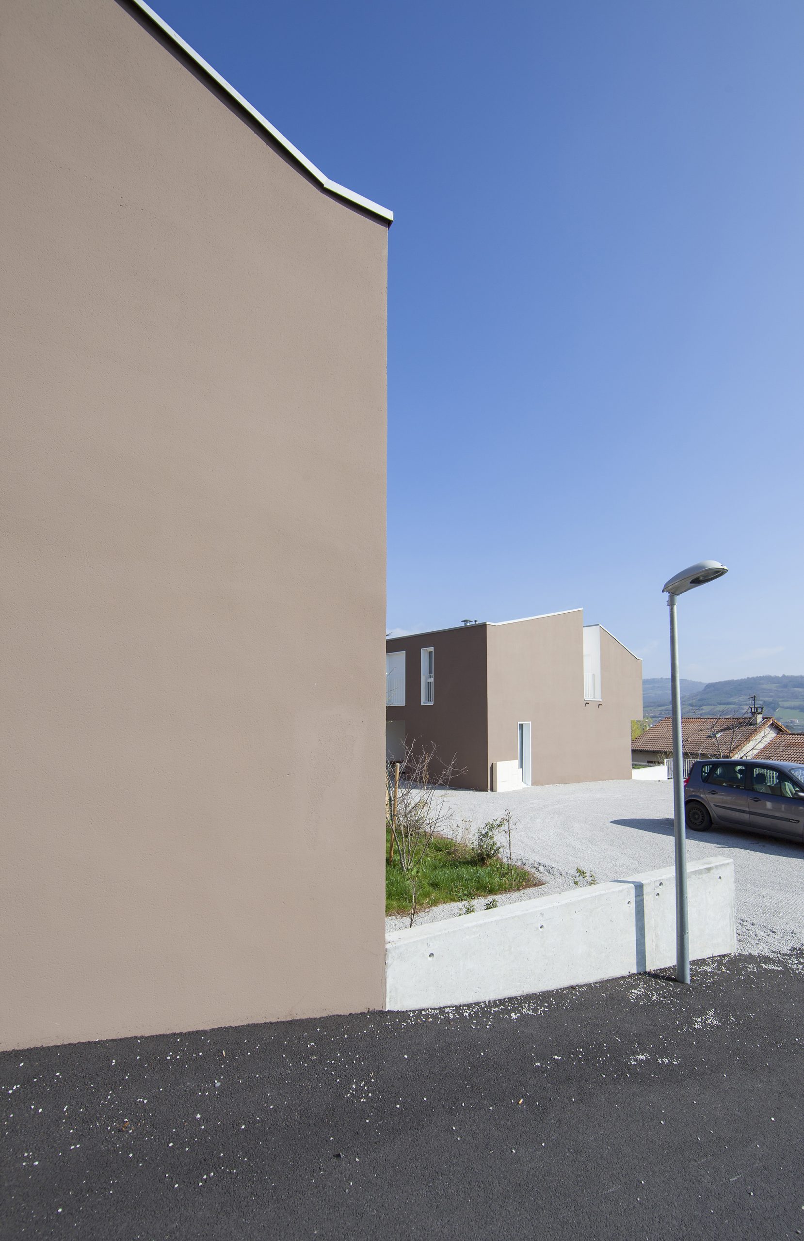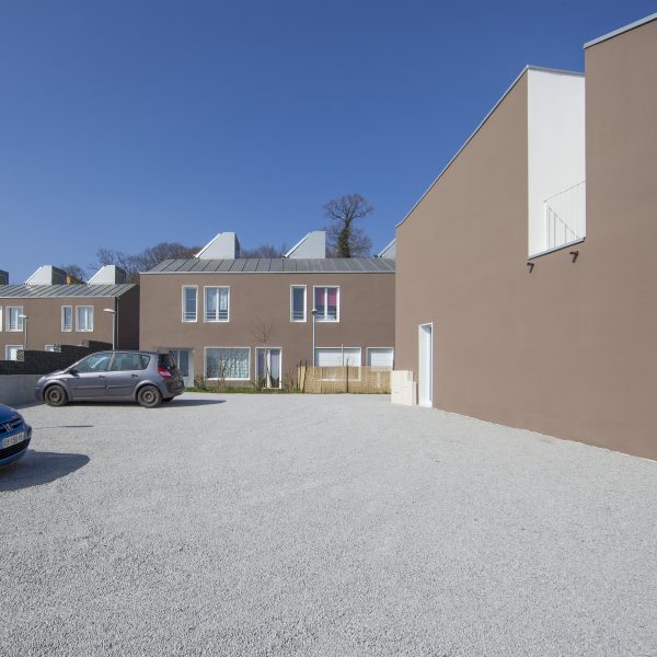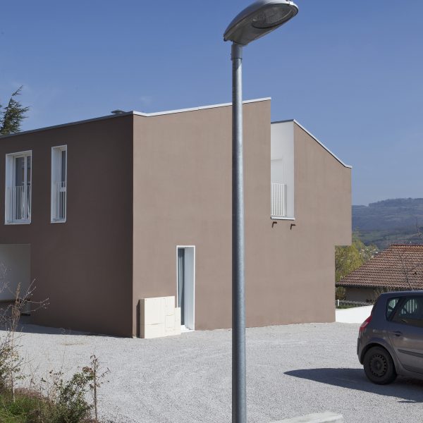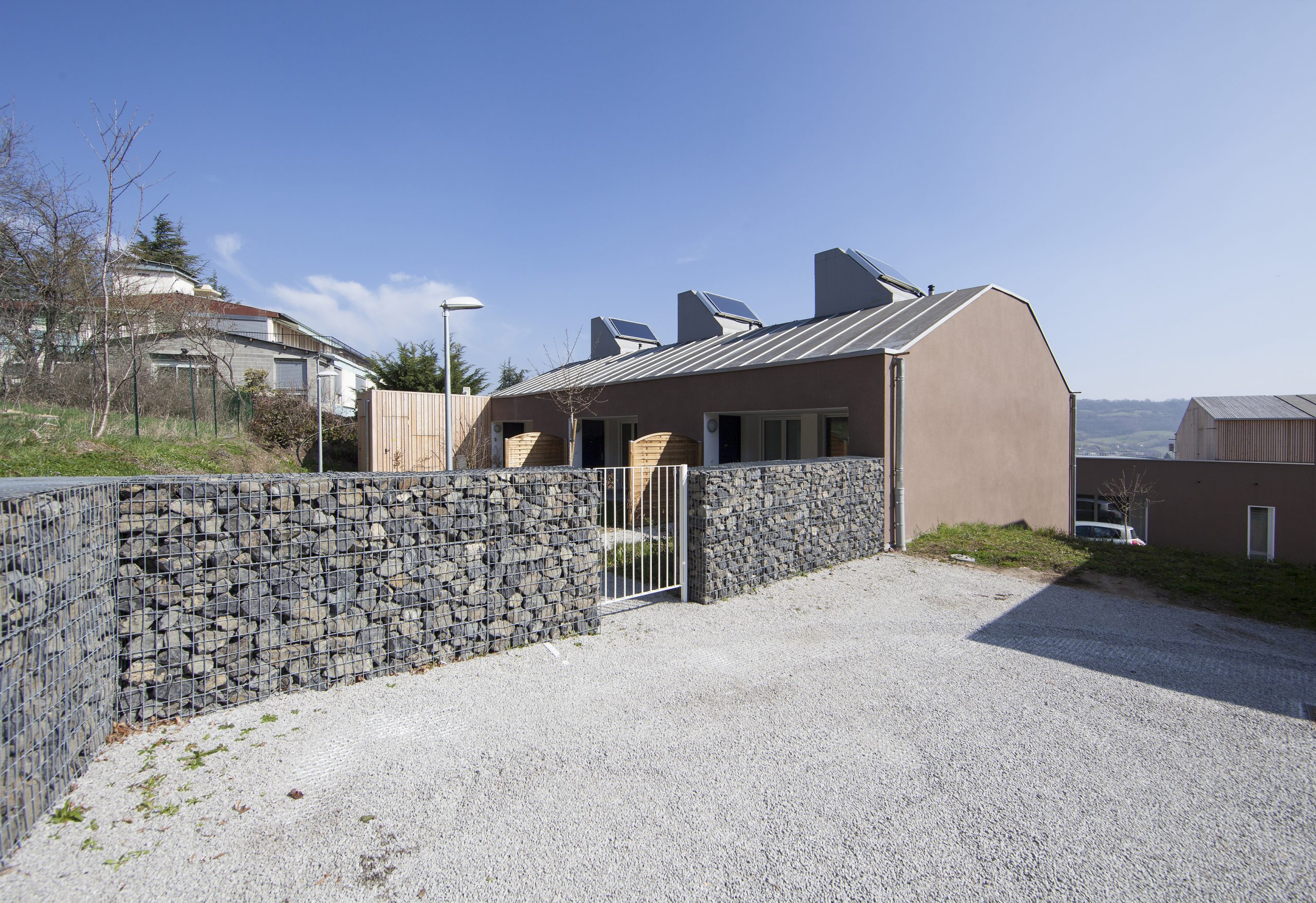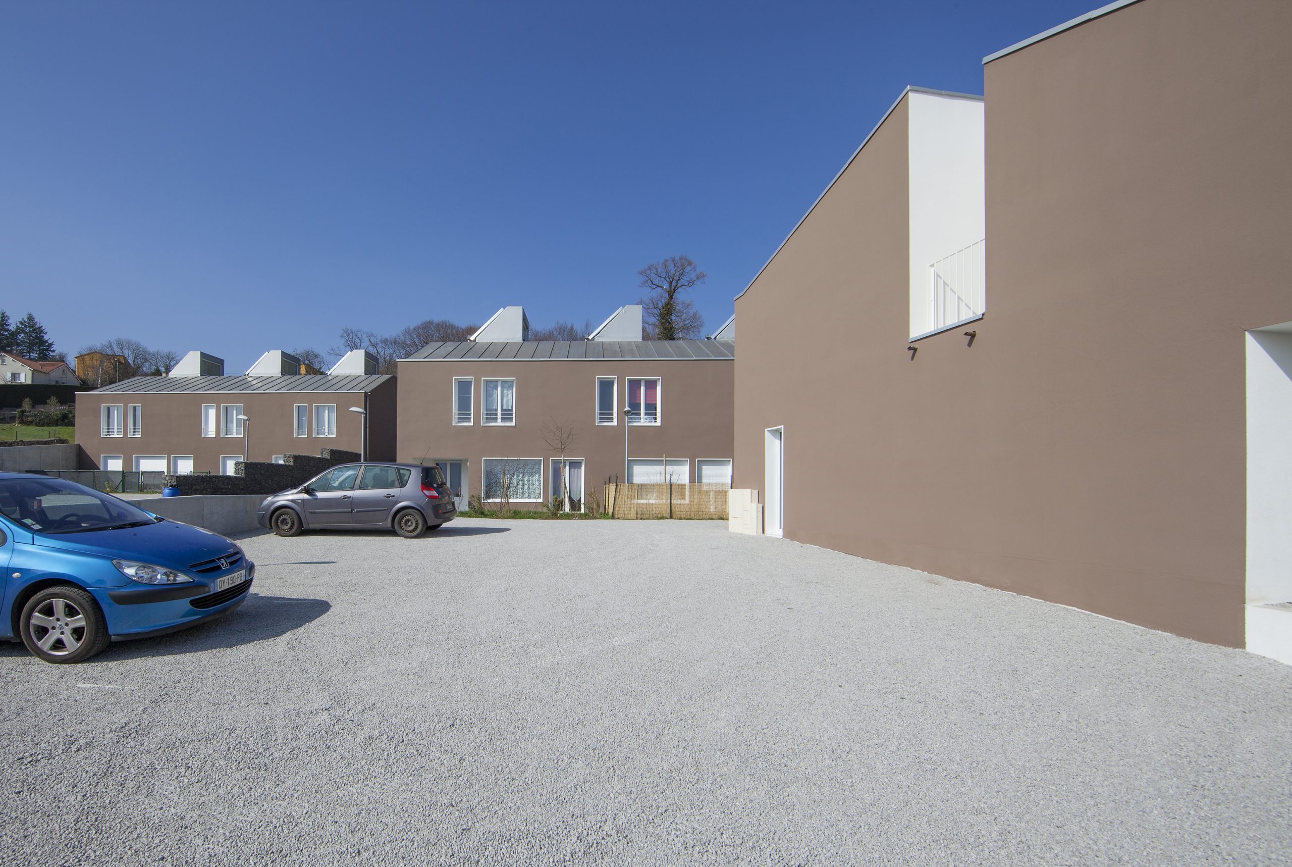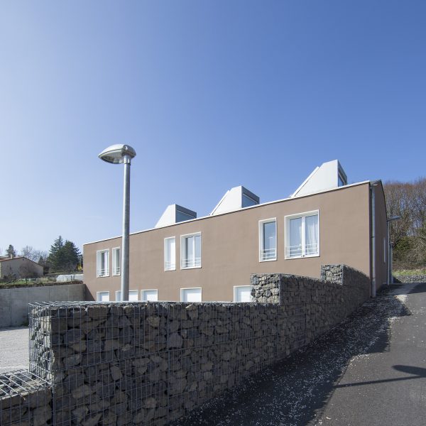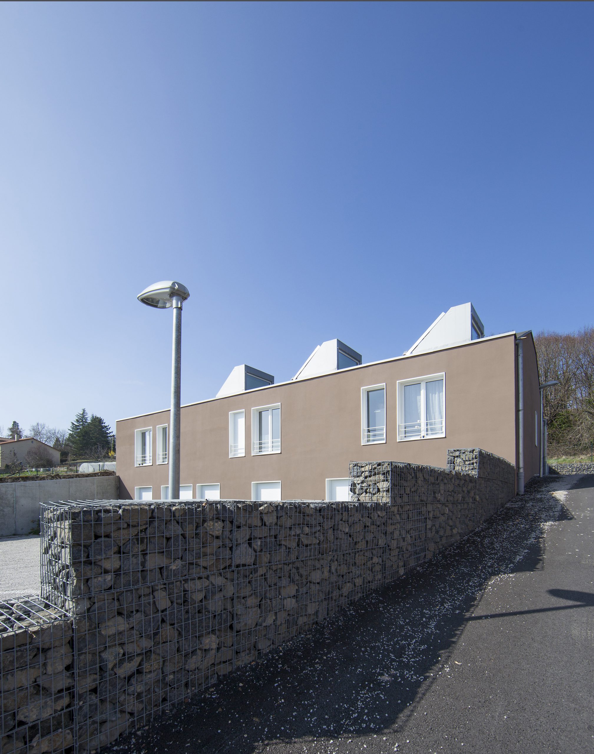Projet de construction de 20 logements locatifs sociaux situé au Clos de Beauregard à Chadrac en Haute-Loire. La parcelle se situe sur les hauteurs de Chadrac, dans une partie de la ville au tissu lâche, composé dans sa quasi-to- talité de maisons individuelles. Les cheminements de véhicules dans la parcelle sont réduits à leur strict minimum pour laisser le plus de place possible aux cheminements piétons et aux espaces végé- talisés. Ensuite, les accès à chaque logement se font de manière individualisé, garantissant un compromis entre l’unité architecturale du projet et la sensation d’indépen- dance de chaque appartement. L’ensemble des appartements bénéficient d’un espace extérieur privatisé donnant sur l’entrée des logements. Les autres espaces extérieurs sont en talus enherbés de manière à limiter au maximum les murs de soutènement. Le dessin de la toiture permet l’intégration de panneaux solaires orientés au Sud tout en favorisant l’apport de lumière naturelle zénithale au cœur des logements.