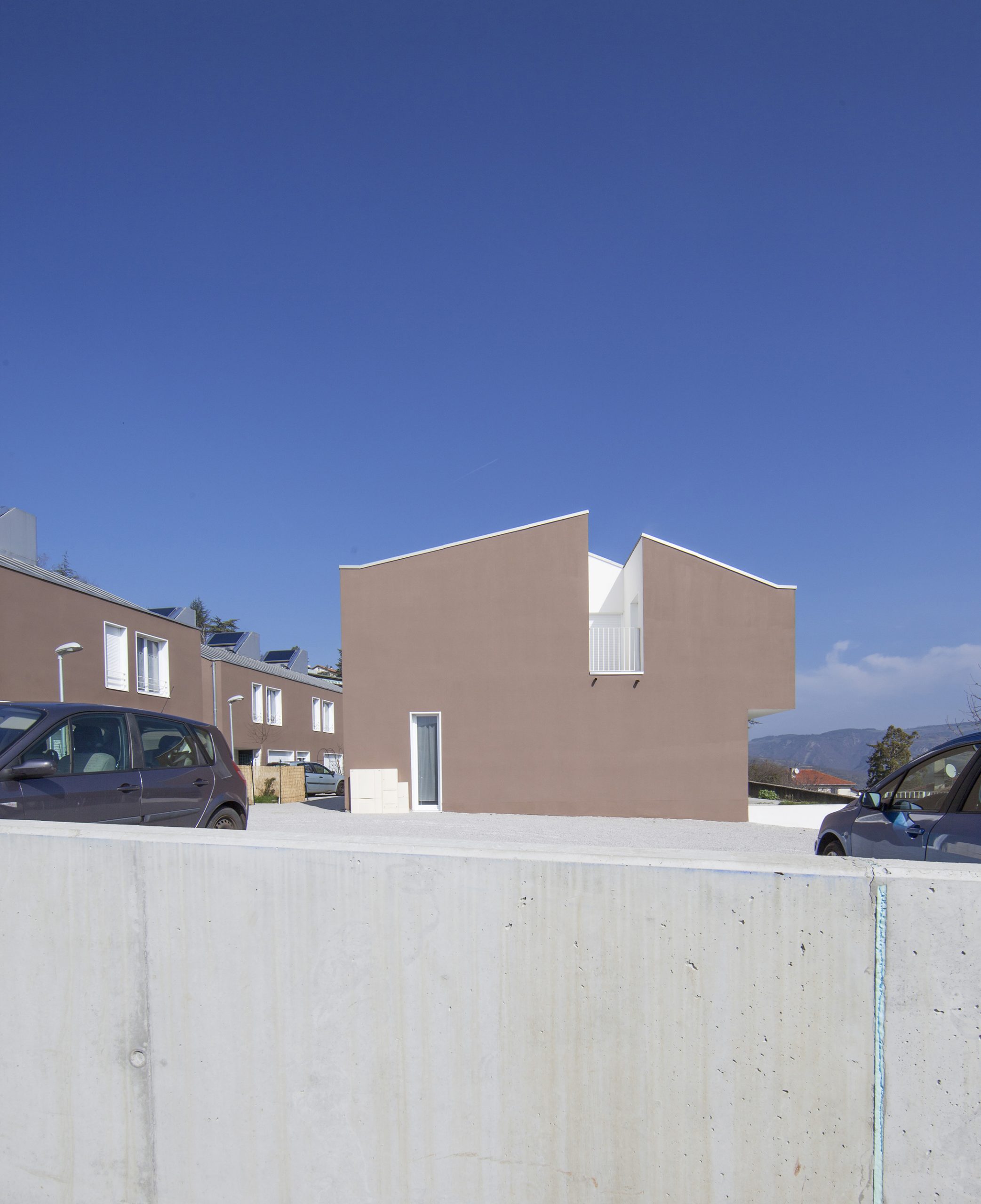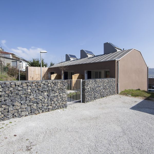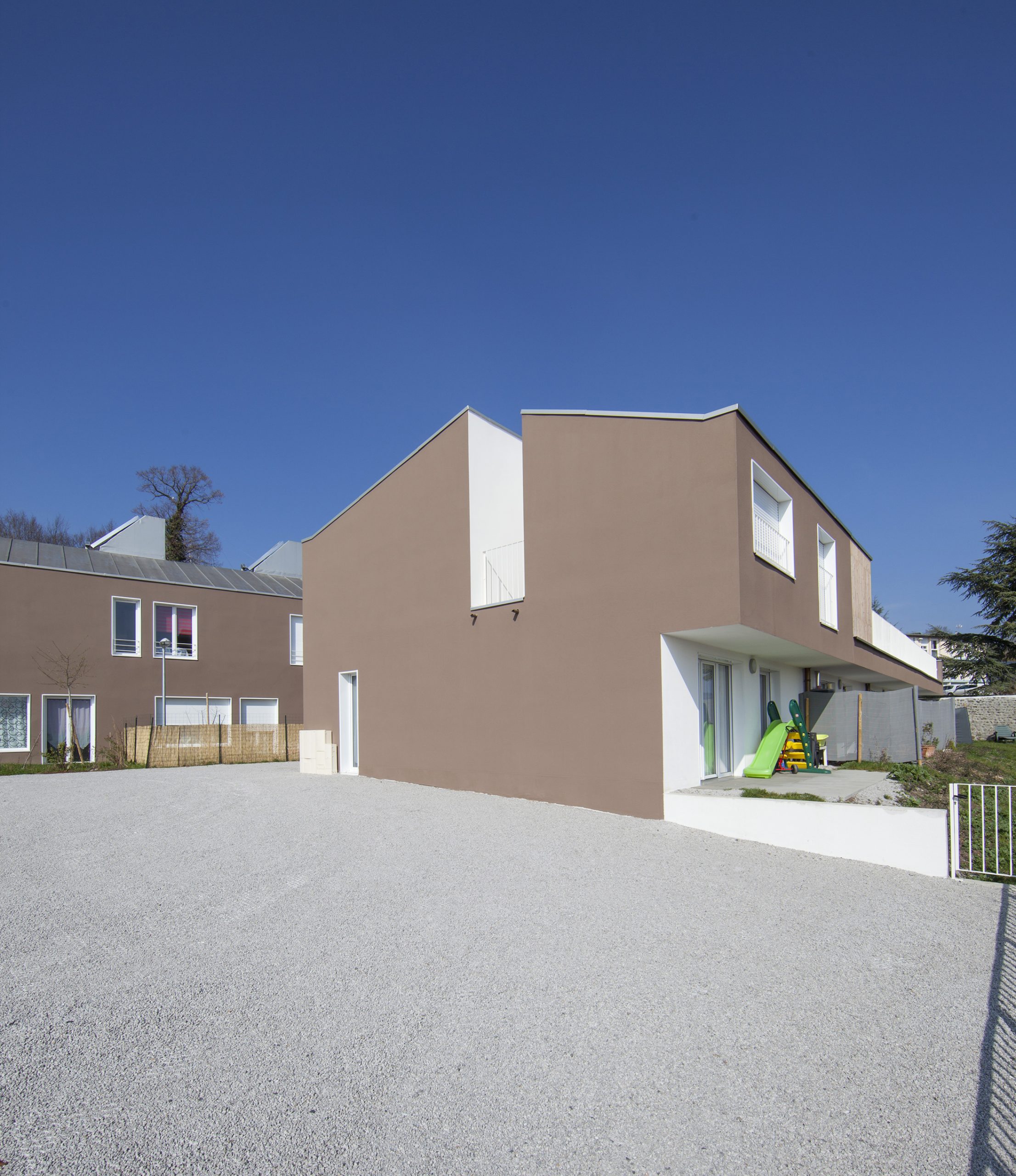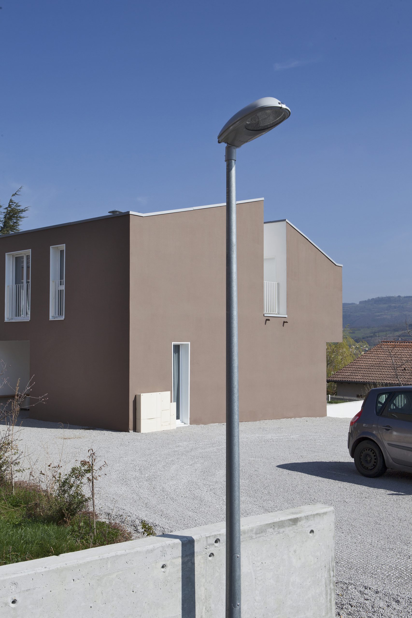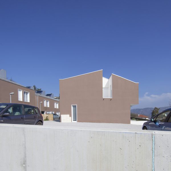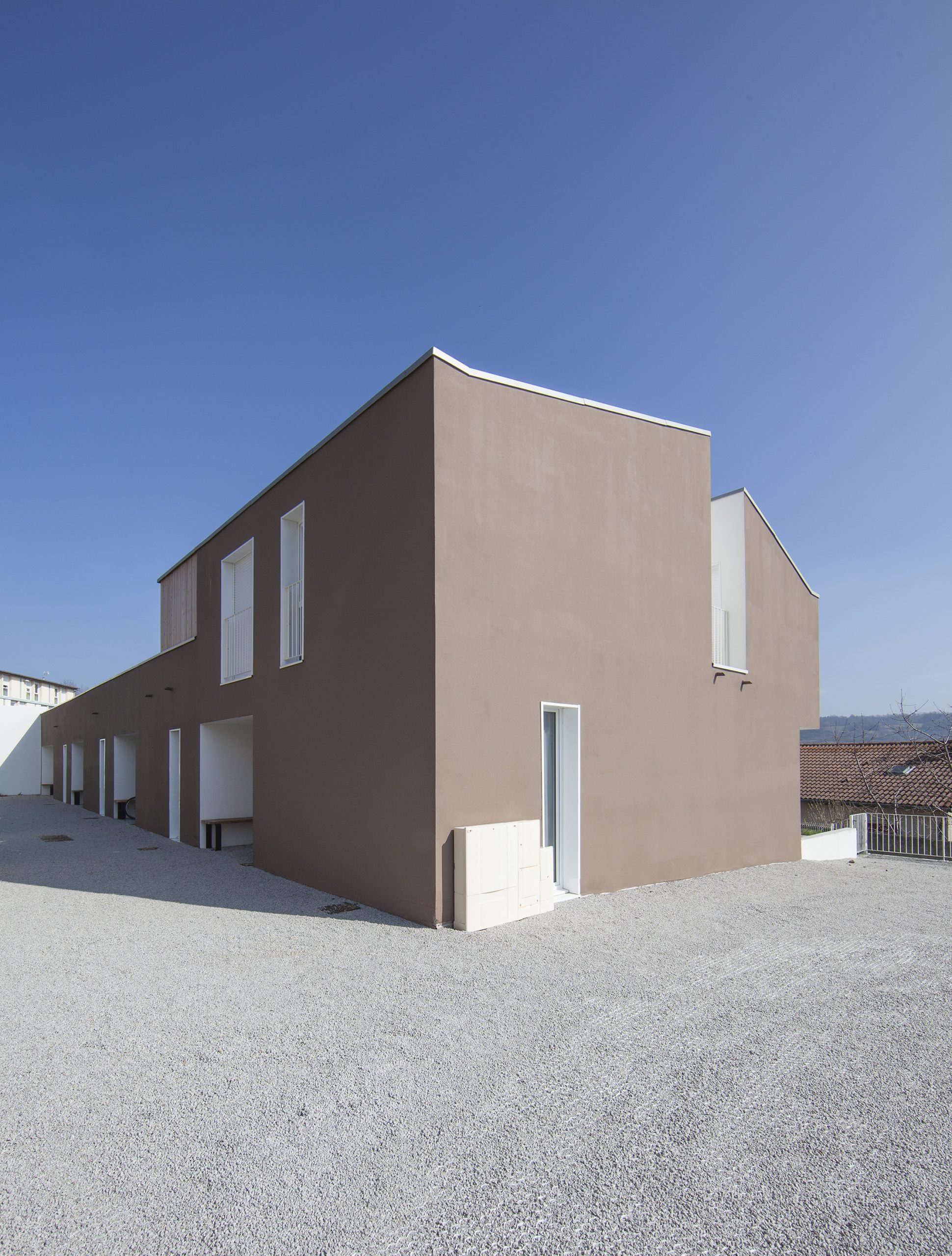 Projet de construction de 20 logements locatifs sociaux situé au Clos de Beauregard à Chadrac en Haute-Loire. La parcelle se situe sur les hauteurs de Chadrac, dans une partie de la ville au tissu lâche, composé dans sa quasi-to- talité de maisons individuelles. Les cheminements de véhicules dans la parcelle sont réduits à leur strict minimum pour laisser le plus de place possible aux cheminements piétons et aux espaces végé- talisés. Ensuite, les accès à chaque logement se font de manière individualisé, garantissant un compromis entre l’unité architecturale du projet et la sensation d’indépen- dance de chaque appartement. L’ensemble des appartements bénéficient d’un espace extérieur privatisé donnant sur l’entrée des logements. Les autres espaces extérieurs sont en talus enherbés de manière à limiter au maximum les murs de soutènement. Le dessin de la toiture permet l’intégration de panneaux solaires orientés au Sud tout en favorisant l’apport de lumière naturelle zénithale au cœur des logements.