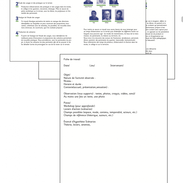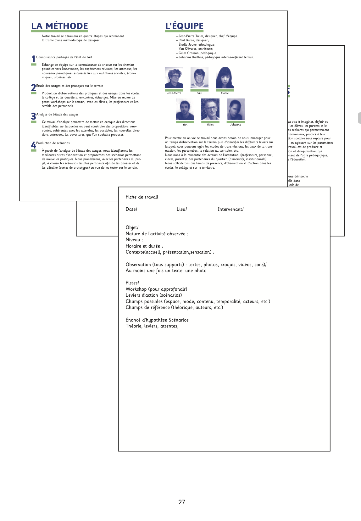 Equipe de recherche : Yan Olivares architecte, Jean-Pierre Tixier designer, Paul Buros designer, Gilles Grosson pédagogue, Elodie Jouve ethnologue, Johanna Barthas, pédagogue